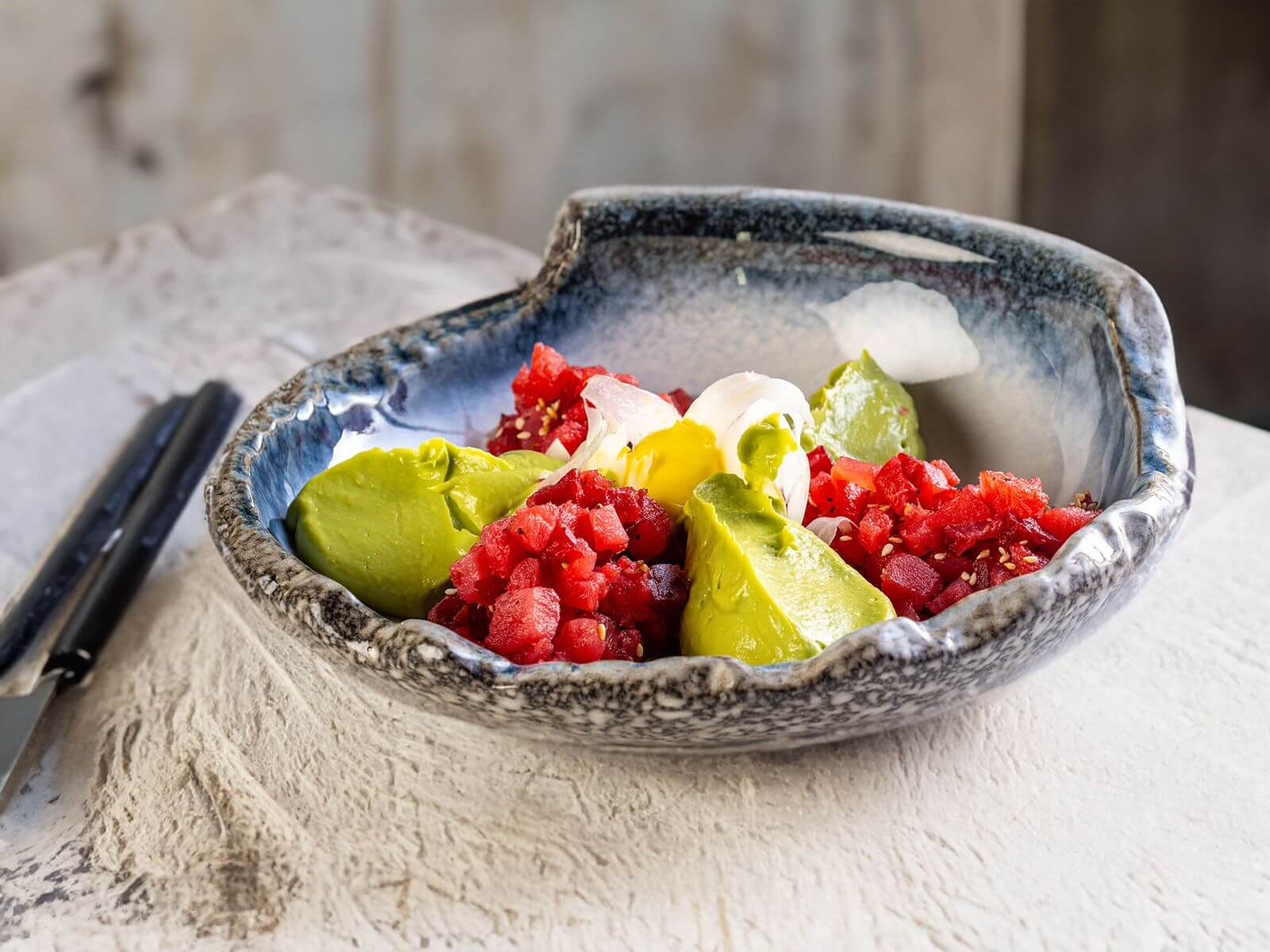 Ton 100g, sfecla rosie 30g, avocado 30g, aioli 30g, rucola 20g, grefa 50g