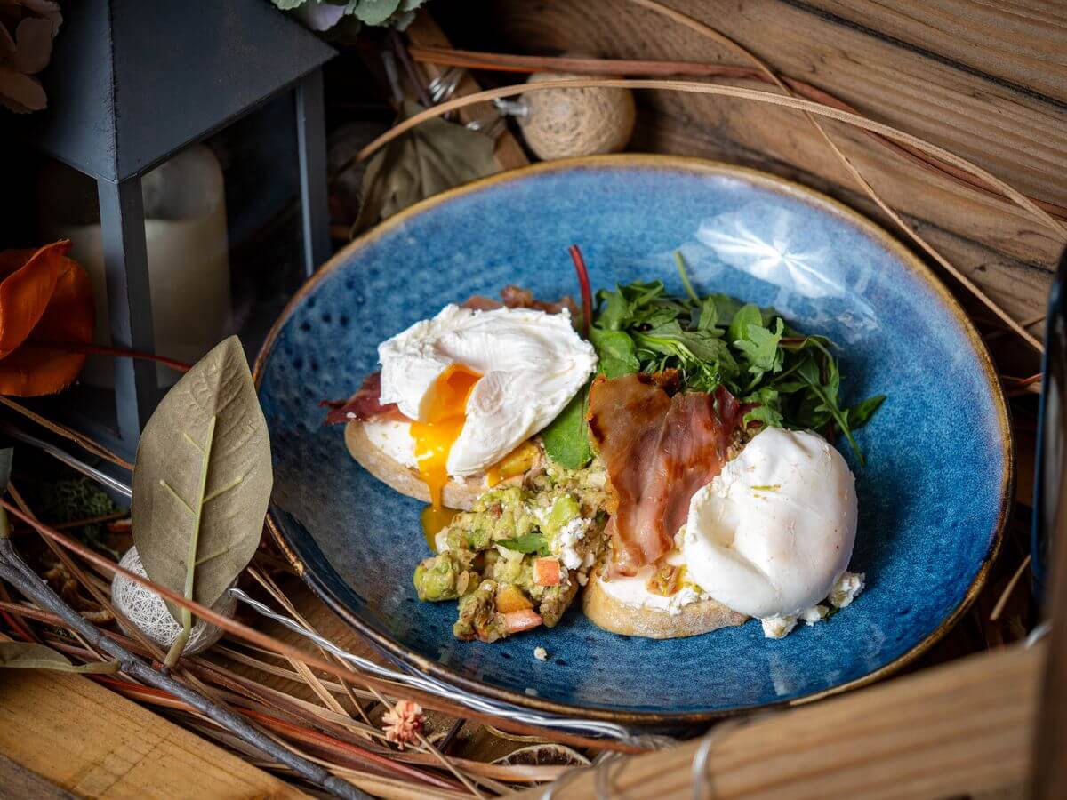 Ouă poșate, avocado, prosciutto, miez de nucă, măr, cremă de brânză