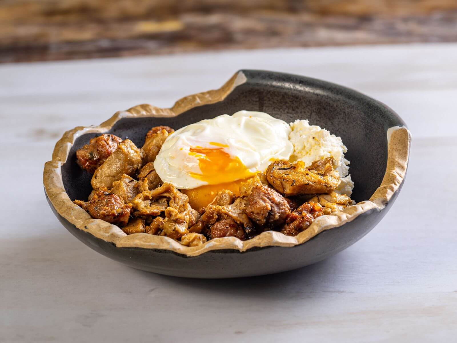 Pulpă de rață confiată, piure de cartofi cu trufe și sos de hrean cu sfeclă roșie